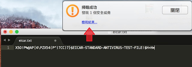 ▲ 測試防毒軟體是否運作,使用EICAR設定的字串做成假病毒,果然被PC-Cillin for MAC成功攔截。