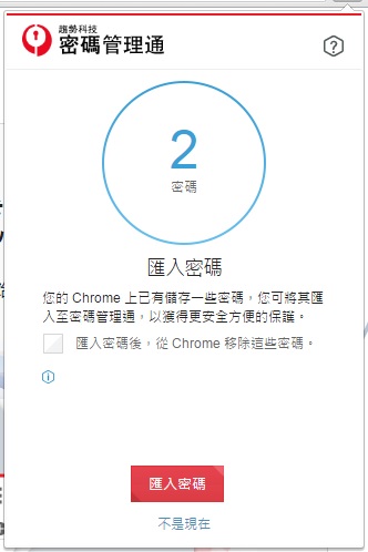 ▲ 按下匯入密碼後,「密碼管理通」就立刻讀取Chrome儲存的密碼,建議勾選方塊,讓「密碼管理通」的資料庫成為密碼的唯一存放地點。