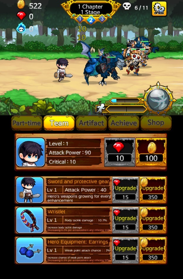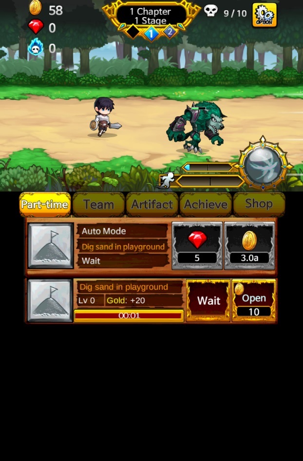 當攻擊開始不足的時候就需要用錢來提升角色的能力,金錢來源要透果左圖的打工來獲取。可以使用金幣來開啟自動打工(Auto Mode),也可以自行點擊工作項目。每個工作都需要不同的時間來完成,完成後將可以獲取相對應的報酬。報酬越高的工作相對的等待時間就會比較長,所以當開啟自動打工之後,就可以把遊戲放置一段時間,等到回來查看時就可以有一筆可觀的收入來提升能力了!!