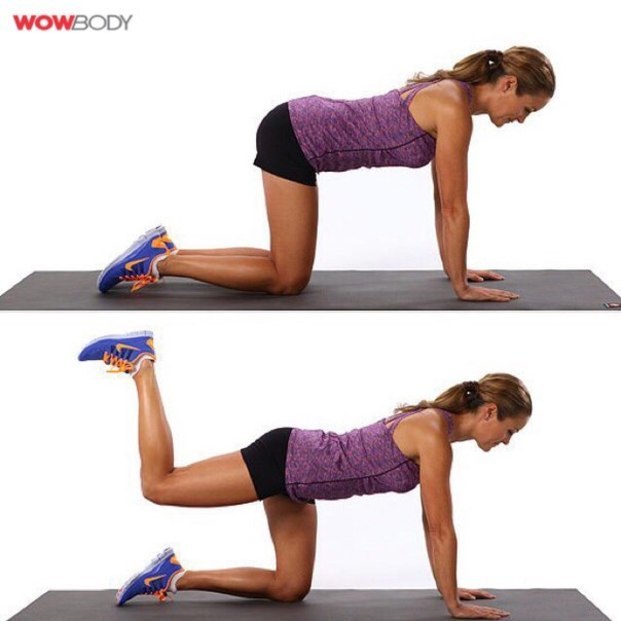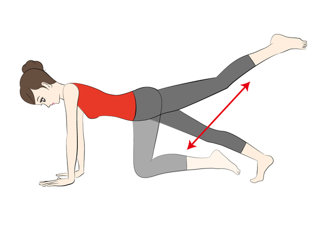 一樣背朝上,雙手撐地板使手臂和地面呈90度,雙膝著地使大腿和小腿呈90度。抬起一隻腿使大腿平行地面,使小腿朝天垂直地面。兩邊交替大約做30輪。