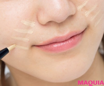 隨著年紀的增長越來越讓人在意的法令紋,就用像是畫貓鬍子一樣的方式畫上遮瑕,再用手指由下往上推勻。