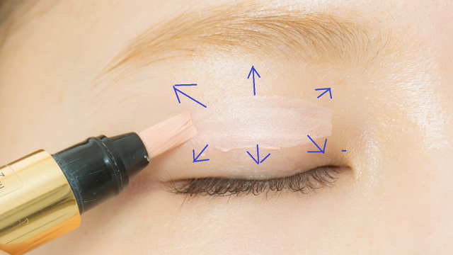 有時候早上起床會有眼部浮腫的問題,這時候再上眼影的話其實看起來會顯老,因此先將遮瑕筆橫畫在眼皮上,再以放射狀的方向推勻。