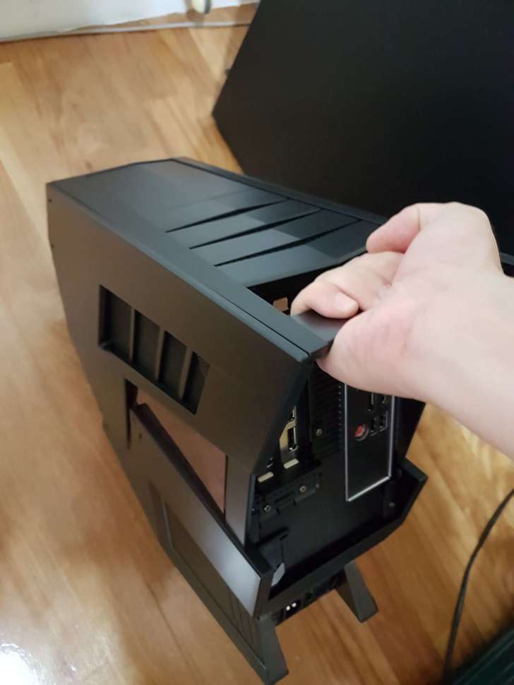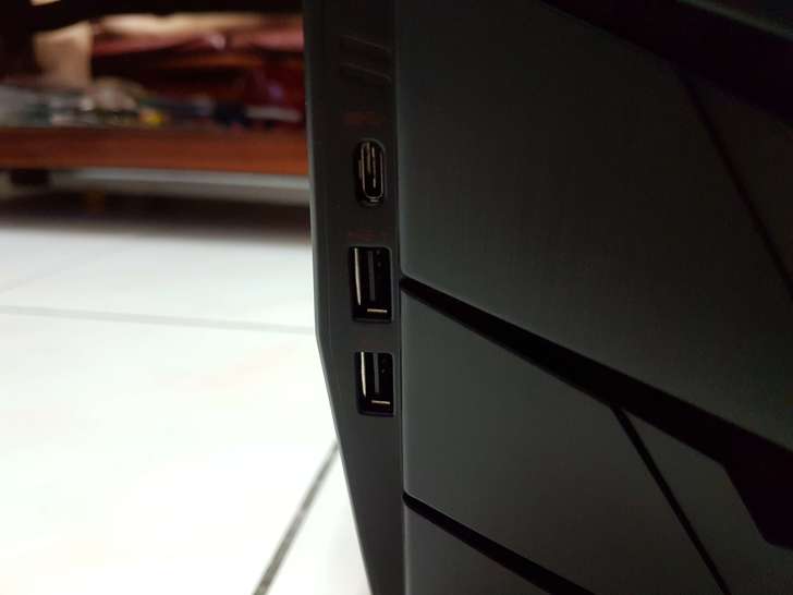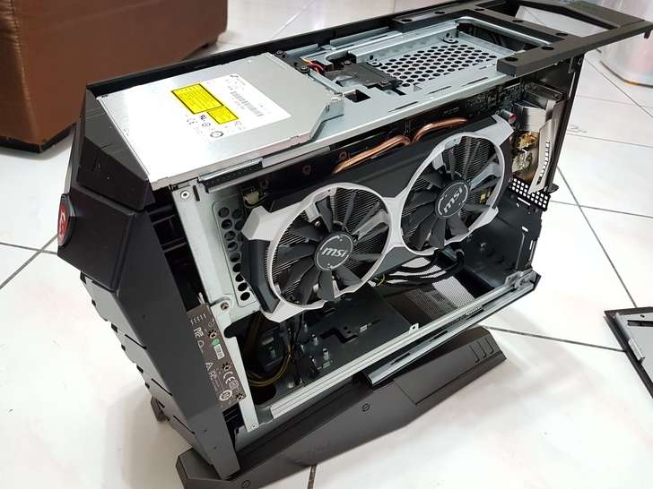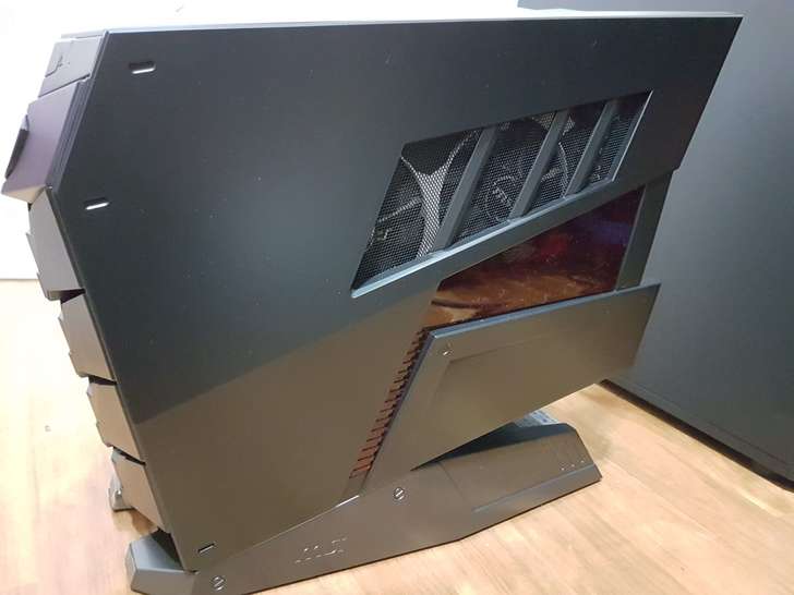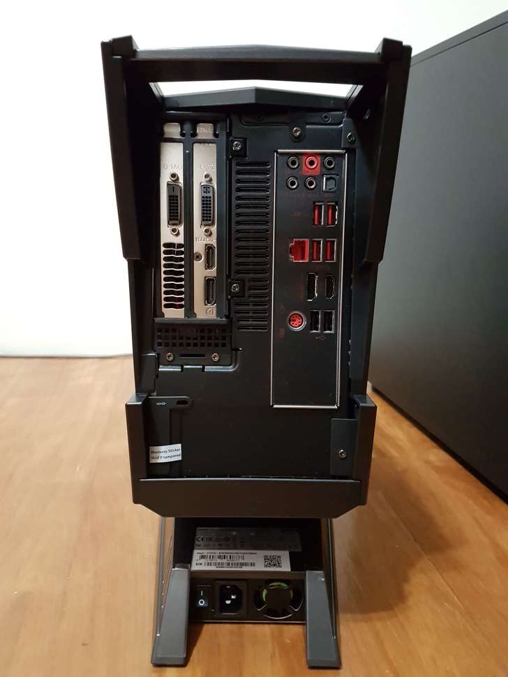 ▲正後方,最下方是電源,算是特製規格,與主機分開,重點是電供它因為不在主機內部,所以有獨自的散熱系統,而傾斜的機身與電源中間的空隙也能協助散熱,讓遊戲運算時的溫度不會高燒不退,悶在機身內,排不出去。