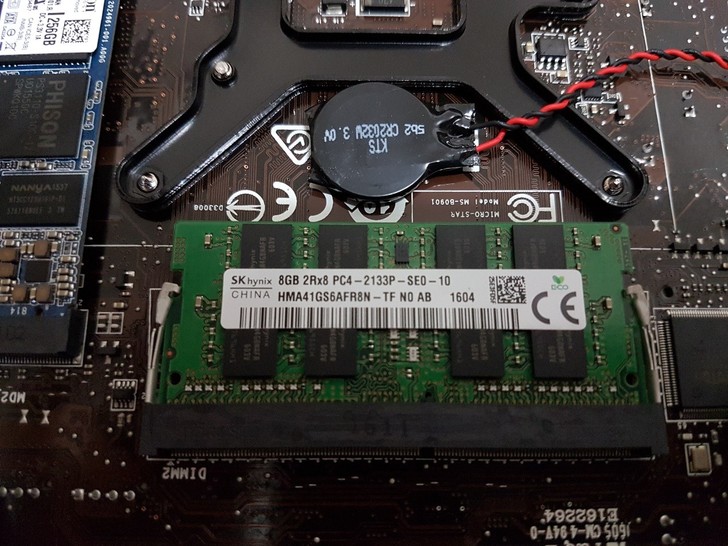 ▲手邊這台神盾宙斯是i7版本,搭配16G的RAM,是兩條8G RAM的配置,圖中外側一條,另一條RAM槽則在板端的內側,記憶體最高支援到32G,覺得記憶體不夠可以隨時往上升級。