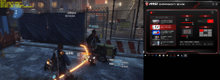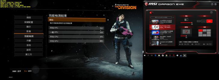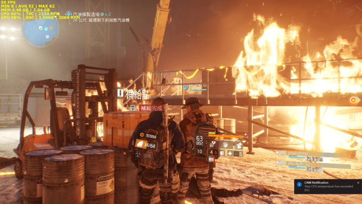 ▲【全境封鎖】用遊戲內建的測試效能也有達標準,打了幾場副本,FPS也是落在55-60上下,也沒特別調整設定,在熊熊烈火的場景下依然不會卡。