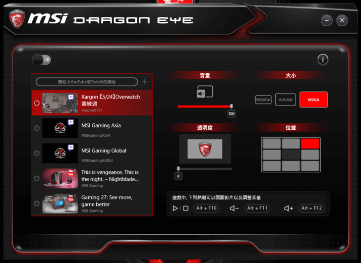 其實設定的部分很直覺,應該不用多作介紹,反正就是可以選擇位置、透明度、大小、實況音量,總之把想撥放的網址輸入進去,一進入遊戲就會自動啟動,而且隨時能做切換……結果還是說完了。