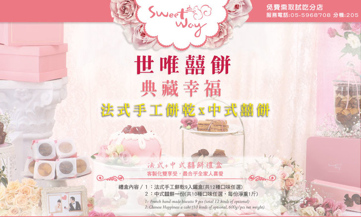 世唯喜餅:http://sweetwaywedding.popularfood.com.tw/ (這間是我最推薦的中法式合併款,可以吃到手工餅乾還有大餅)