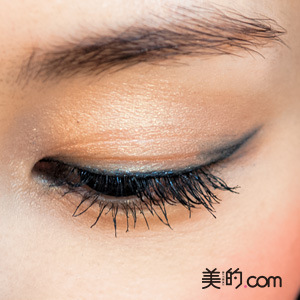 ④ 先畫過眼線之後會比較有立體感,在眼皮加上棕色系的眼影打底,最後最重要的部分就是在棕色和黑色之間,沿著眼線尖端加上藍色的珠光眼影便大功告成!