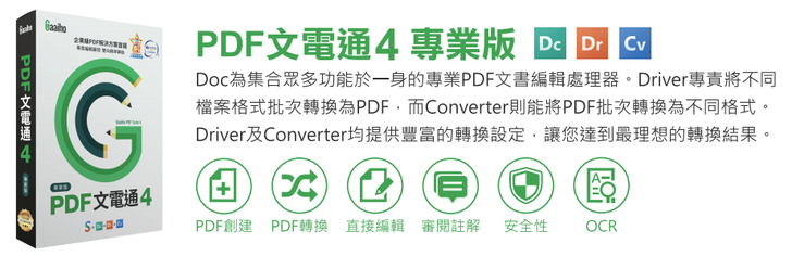 全新PDF文電通4專業版可以編輯、轉換、註解、合併保護文件安全等PDF諸多任務為您一次辦到!大大提升提升工作效率與品質。