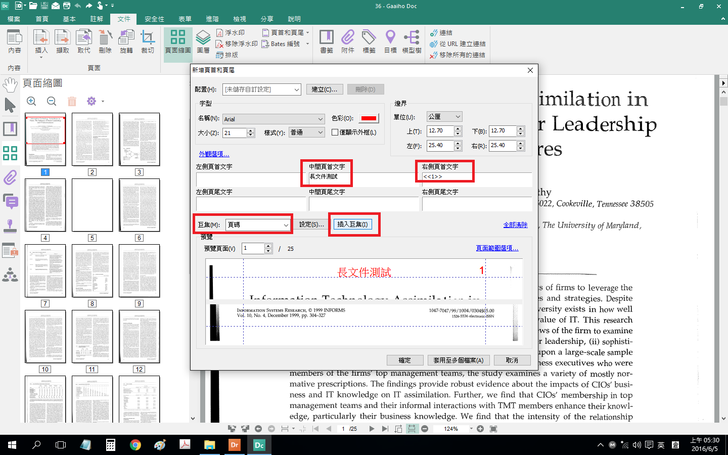 ▼頁首/頁尾設定畫頁。固定頁首的文字標題【長文件測試】、加入頁碼則使用巨集插入右側頁首文字