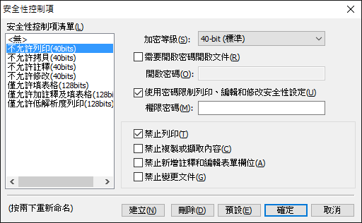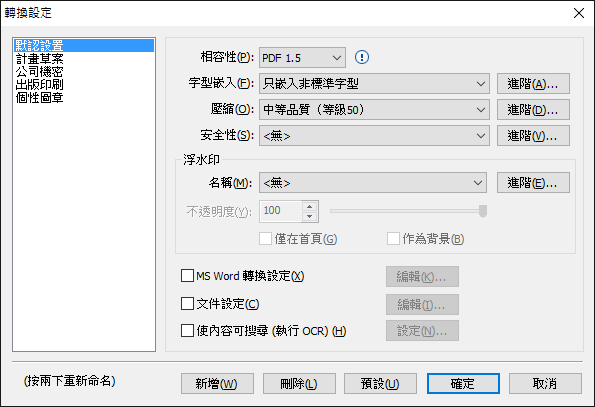 浮水印、字型嵌入、安全性設定、Word 轉換設定等。
