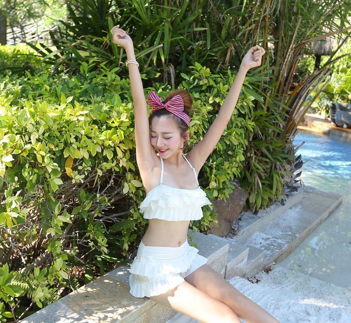 小胸女孩們如果想追求能讓罩杯升級的視覺效果,就可以選擇這類在上半身加入荷葉邊、波浪、皺摺等等各種裝飾的泳衣。