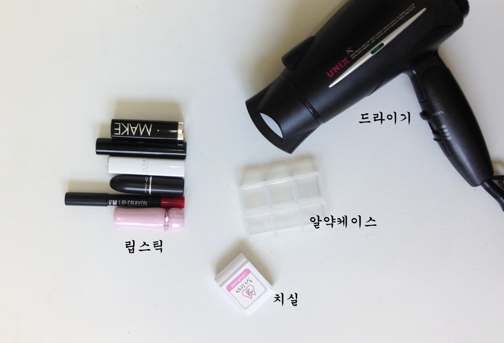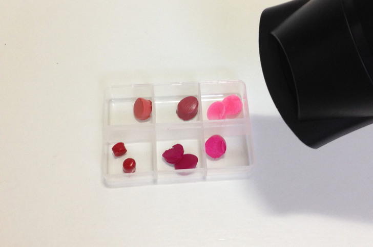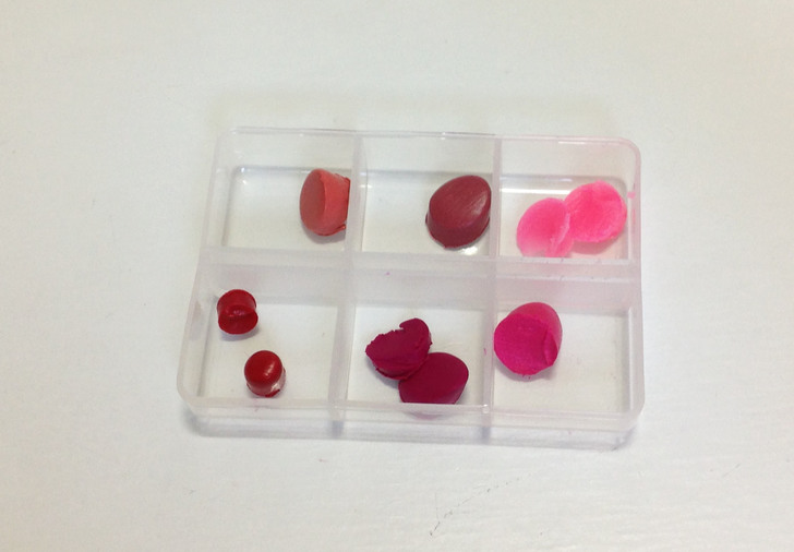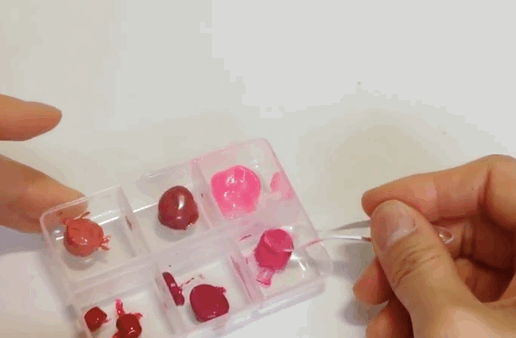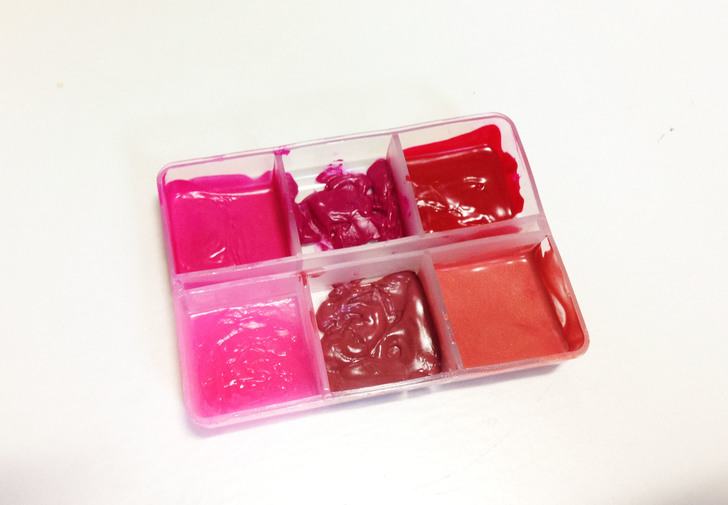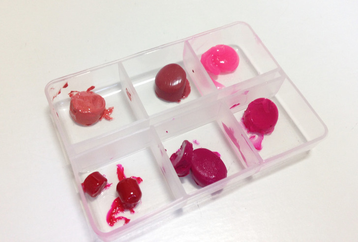 ② 將每個顏色的唇膏都擠出少許的小部分,分別放到收納盒的格子裡。接著使用吹風機將每個顏色吹融化,根據唇膏的顏色特質和材料融化的速率會不同,所以吹的時候要多注意,每個顏色都要徹底融化。