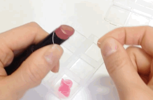③ 等到融化的差不多時,使用手拿的小支塑膠抹棒或抹刀將融化的唇膏抹平均勻於格子內。