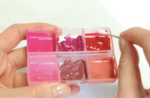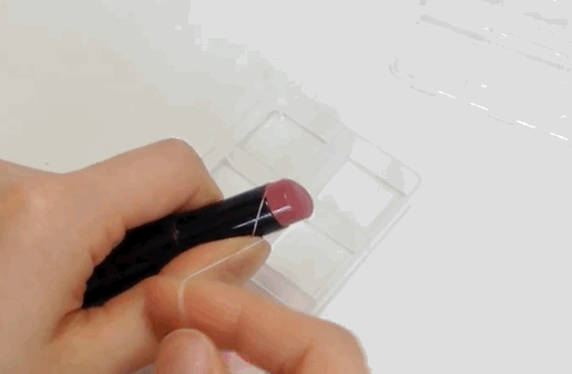 ④ 唇膏可能會因材質不同而無法均勻填滿格子,這時候用棉花棒輔助,將唇膏推勻到格子的四個小角落。