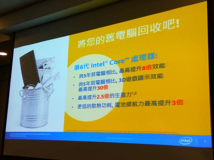 ▲新的第六代CPU,有非常多進步的數字,為何要跟5年前比,在場網友統計,大家不太愛換NB,因為效能仍可用,多數使用超過5年,但新數字告訴你,該把舊NB丟了。