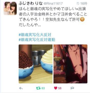 @Rina11617「真的希望不要真人化啊,除非出演者是個有辦法吃掉宇治金時飯或美乃滋飯的傢伙!空知老師真的許可真人化嗎⋯⋯」