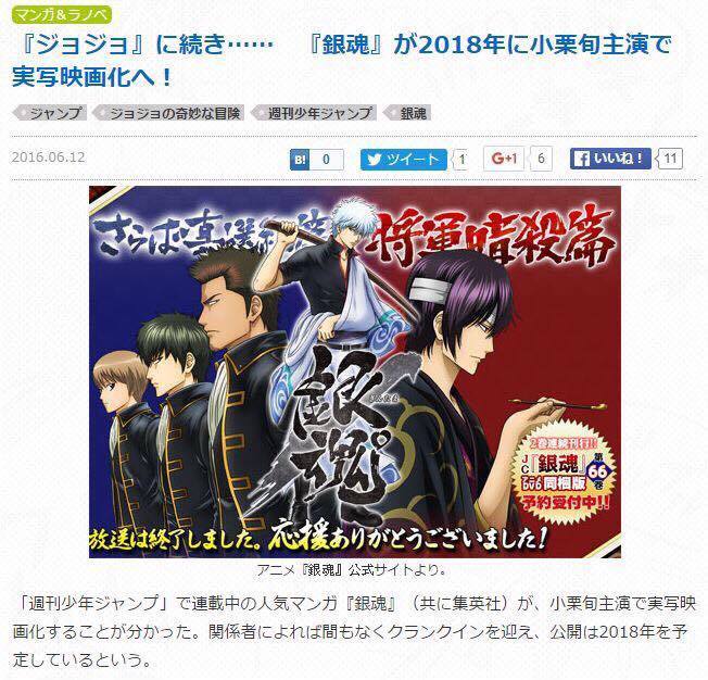 日媒《otapol》的報導指出《銀魂》要翻拍成真人版電影,預定將於2018年上映,由影星小栗旬主演坂本銀時。