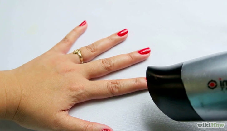 吹風機調成冷風階段吹指甲,讓指甲油和指甲間不產生任何氣泡。建議先塗好一隻手吹乾,再塗另一隻手吹乾,避免手握吹風機的時候摩擦到未乾的指甲油。
