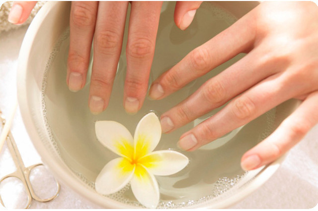 等到指甲油大致上都乾了之後,用小盆子裝冷水並將雙手浸泡在內讓指甲油穩定凝色。注意因為指甲油性質皆不盡相同,浸泡之後某些指甲油的顏色光澤可能會消褪。