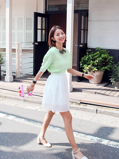 夏季針織選擇寬圓領的五分袖,再挑最不容易吸熱的白色,穿起來會比較清爽舒適。薄紗裙那隱約可看見腿的設計讓你走起路來都很通風。