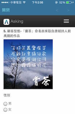 Asking包含了大多數問卷調查所需要的題型,例如:選擇題、程度式選項、下拉式選單、身分輸入題和文字輸入題。依序把「問卷標題」、「問卷開始前說明」以及把題目分別輸入好,幾乎不需要適應介面的時間,問卷很快的就完成囉!