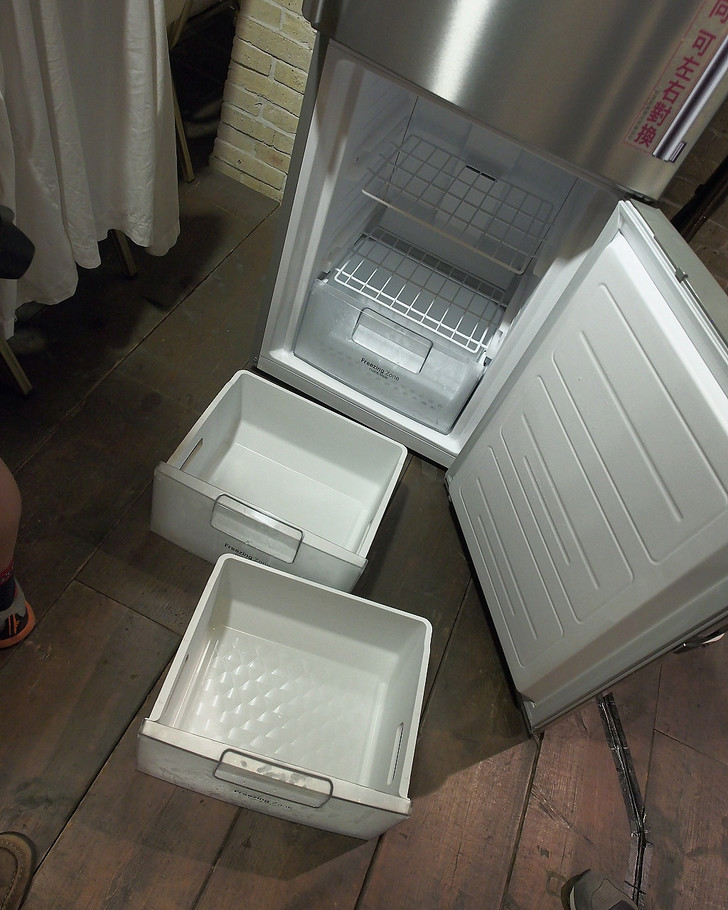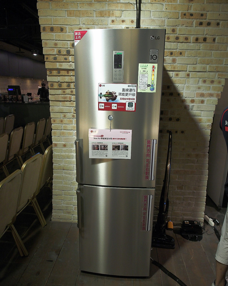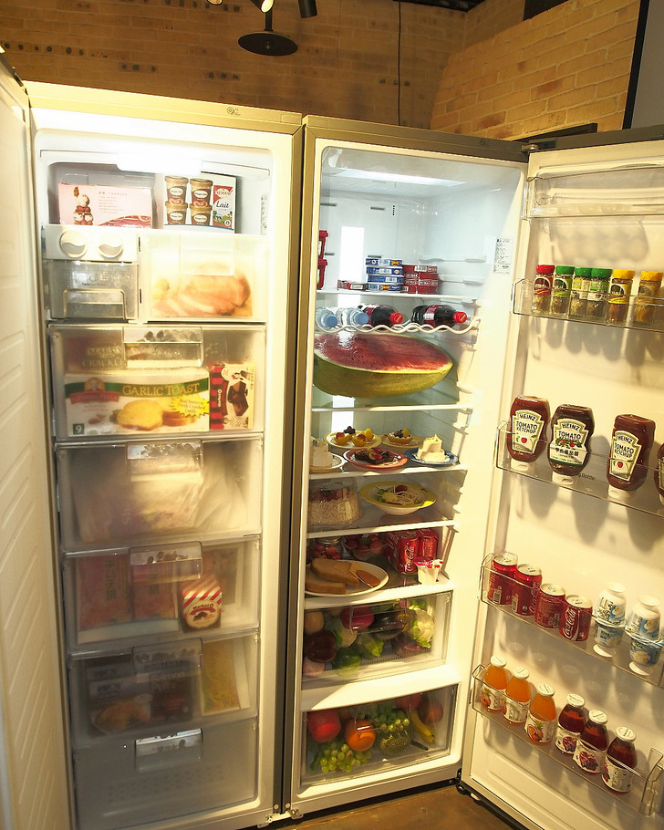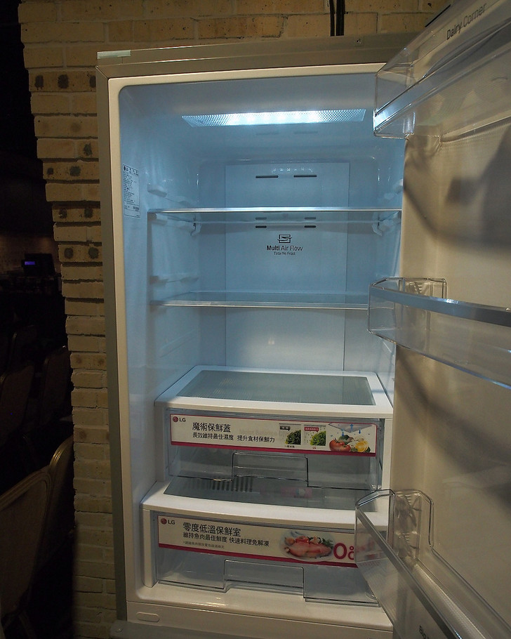 也許有人會認為寬僅59.5cm的冰箱,內部空間扣除冰箱壁應該不太大才對。但事實並非如此。小弟在活動開始前先拍了冰箱開門的照片,不論冷藏箱或冷凍箱,均因薄壁設計而使內部擁有大容量,連西瓜都可以剖半放入了,看倌您說空間大不大?