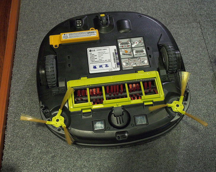 在休息時間體驗的時候,為了更清楚掃地機器人的各項配備,特地把機器人「翻身」,讓大家看看它的底部,發現在前、後、左前、右前都有電眼。原來就是靠這些電眼讓機器人不會掉到高台下的。