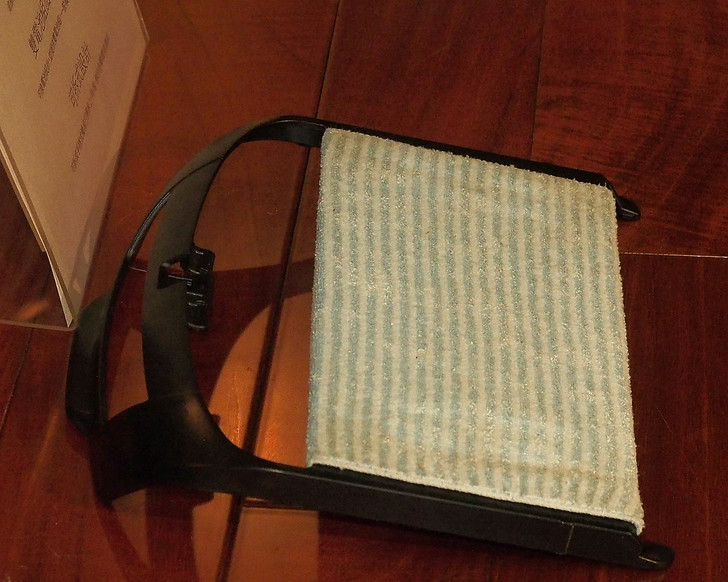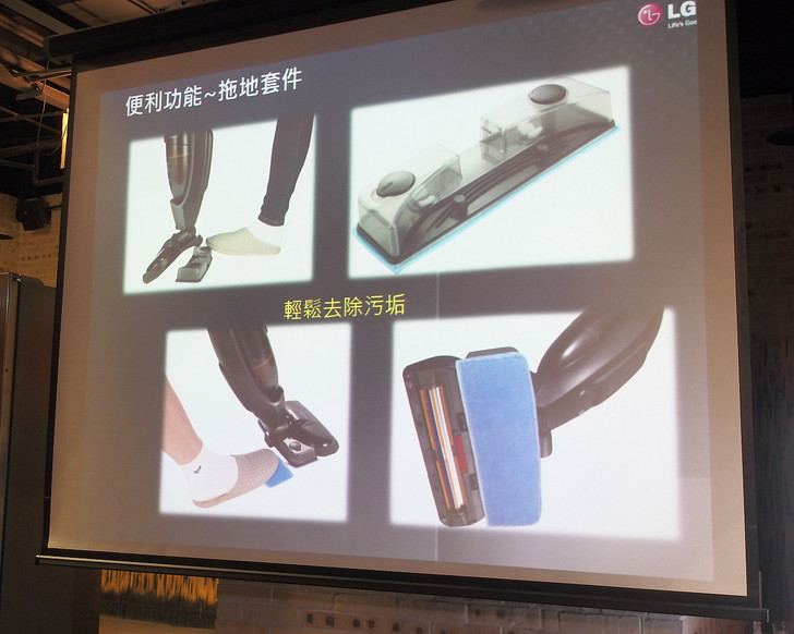 雖然直立式吸塵器已經不是新產品,但LG擅長在舊產品上擴充功能。這個拖地套件,小弟在上次體驗會中就沒有見到。它是個外加的吸頭,上面貼了一塊抺布,可以達到擦地板的效果。