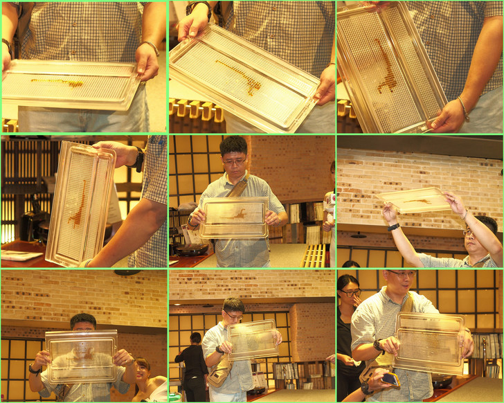 在實際狀況下,由於保鮮蓋上的蜂巢式設計,在上面的水份的確不容易滴落。David找了一位網友上台示範。滴在保鮮蓋上的水份真的不容易掉下來。