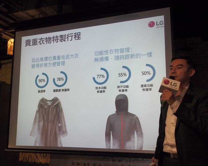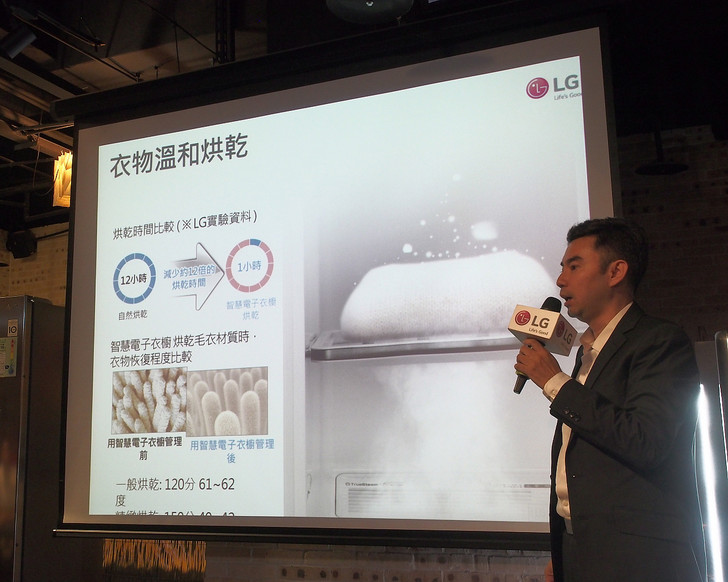 一陣騷動後,回歸機器的介紹。Styler衣櫥除了有除塵和除皺的功能外,它還有溫和烘乾的功能。從投影片中可以看到經過這神奇的機器處理後,原本塌陷、萎縮的衣物絨毛都站起來了,衣物變回膨鬆。個人認為這適用於常要送乾洗的衣物,例如毛料西裝、毛衣等,這些衣服常送洗,衣服上的細小絨毛會磨損,久了就失去衣服原本的樣子。但用這機器處理,這些細小絨毛基本上是不會受損的。