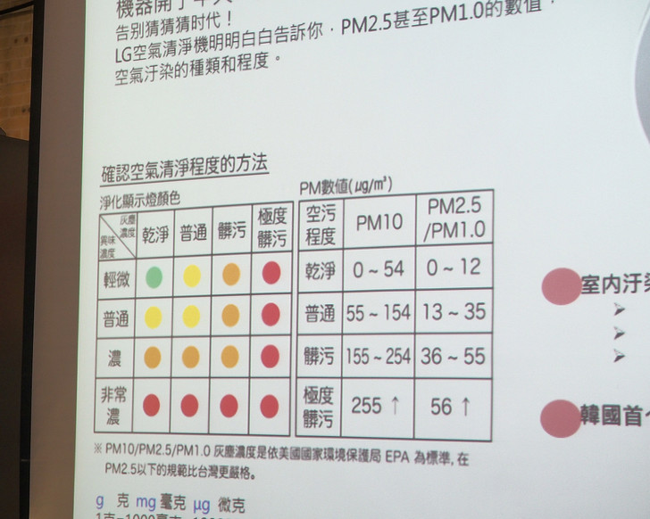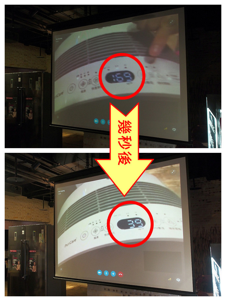 從大螢幕上可以看到空氣清淨機的顆粒指數由169,瞬間降到39的環境背景值。