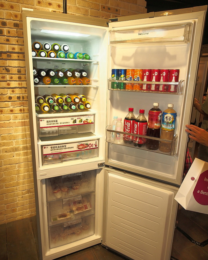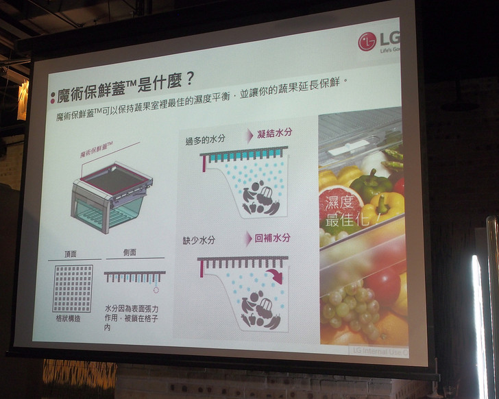 那,這麼多的食品放在冰箱中,「冰到乾掉」是以往的冰箱裡很常見的事,但LG的「魔術保鮮蓋」 就可以避免這種狀況的發生,因為它會防止水份散失。