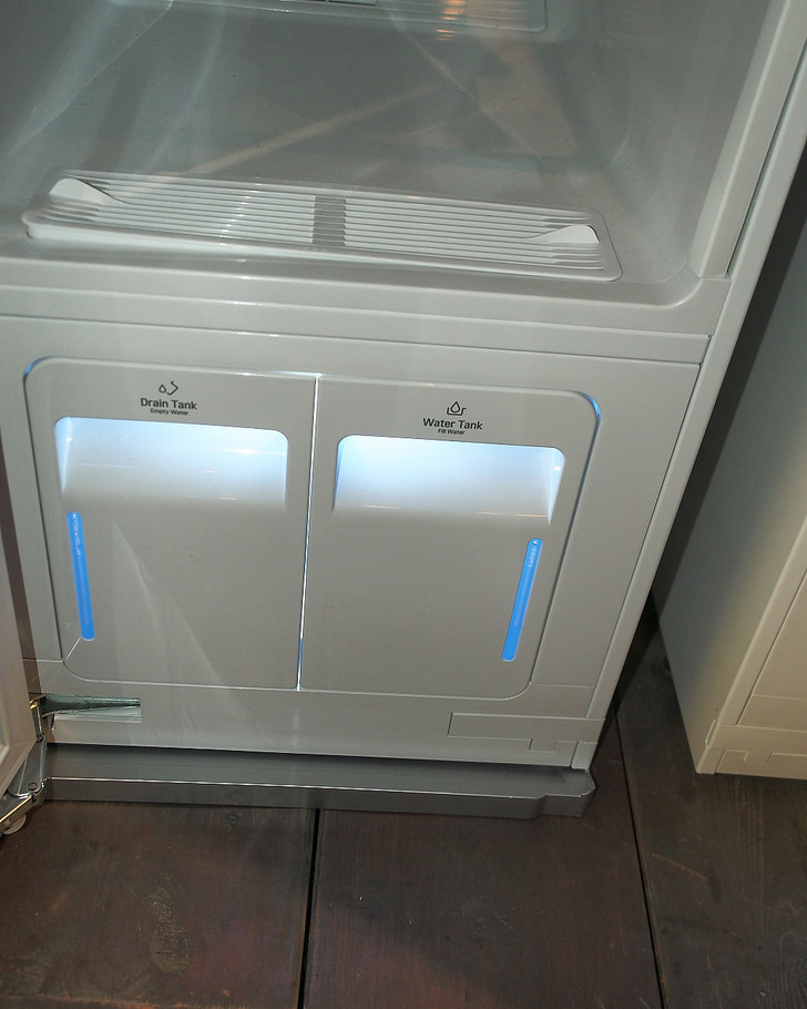在衣櫥的下方有2個水槽,一個是烘乾時的廢水,另一個是使用蒸氣除臭殺菌時使用的水。