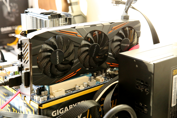 安裝上機的示意圖(非評測平台),這邊要提醒一下假設今天GTX1070 G1 GAMING是裝在M-ATX的主機板上,可能要注意一下SATA Port的位置是否會干涉到,實裝起來會比M-ATX還要長些。