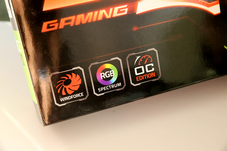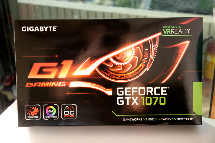 由於GTX1070為中高階的遊戲顯示卡,在包裝設計上也從動物的眼睛直接進化成看起來比較厲害的橘黃色機械眼,除了前面所提到目前可以跟潮牌EVGA互相抗衡的五年保固外,這次G1 GAMING比較有特色的就是多了RGB的燈光效果 (今年是RGB元年),以及使用兩根熱導管搭配3風扇來進行散熱,效果如何後面會有實測!