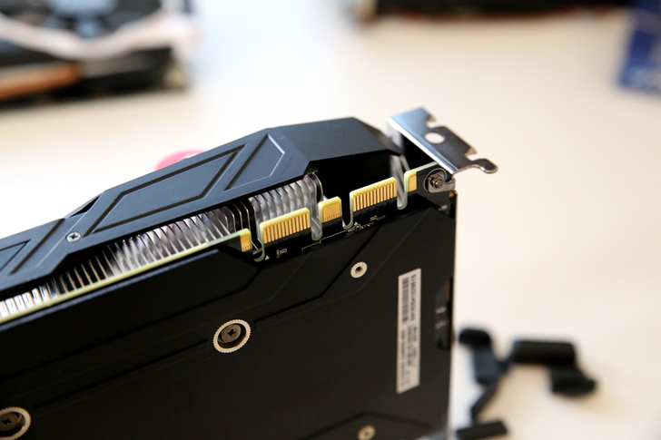 中高階顯示卡必配的SLI端子接口,只是網路上有其他玩家指出舊版的橋接器似乎無法在上面發揮作用,應購入新版本的SLI橋接器。