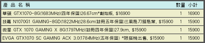 目前GTX1070顯示卡在台灣市場的零售價格均在$15,900(稅後),華碩的售價則是貴 $1000元,若你是保固期間至上的玩家,那GIGABYTE GTX1070 G1 GAMING或是 EVGA GTX1070 SC GAMING 會是最佳選擇,只可惜目前EVGA的GTX1070似乎僅能搭機來出售,大概是數量較少的關係,而GIGABYTE GTX1070 G1 GAMING則是可以玩玩RGB的燈光效果也算是個不錯的加值服務。