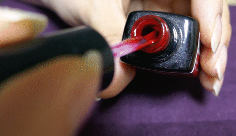 開蓋後將刷頭在瓶口處調整紅色的指甲油量。