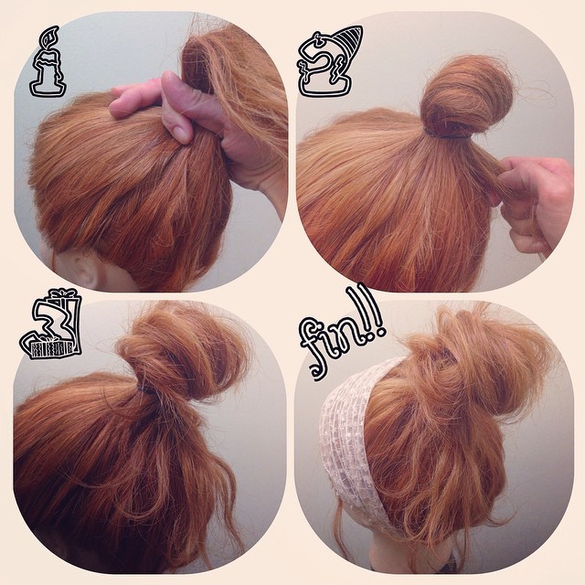 ② 用橡皮筋綁起來但在繞完最後一圈時留一顆包包頭的大小,只讓一點髮尾出來。
