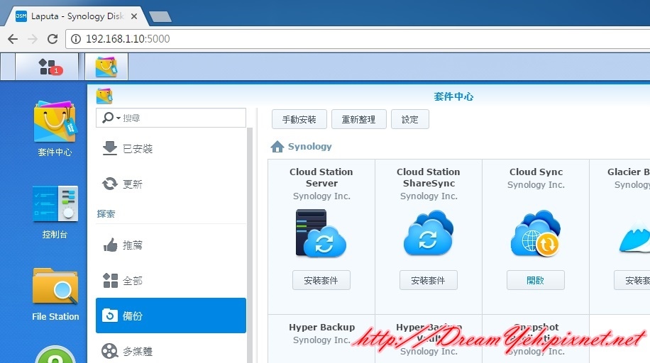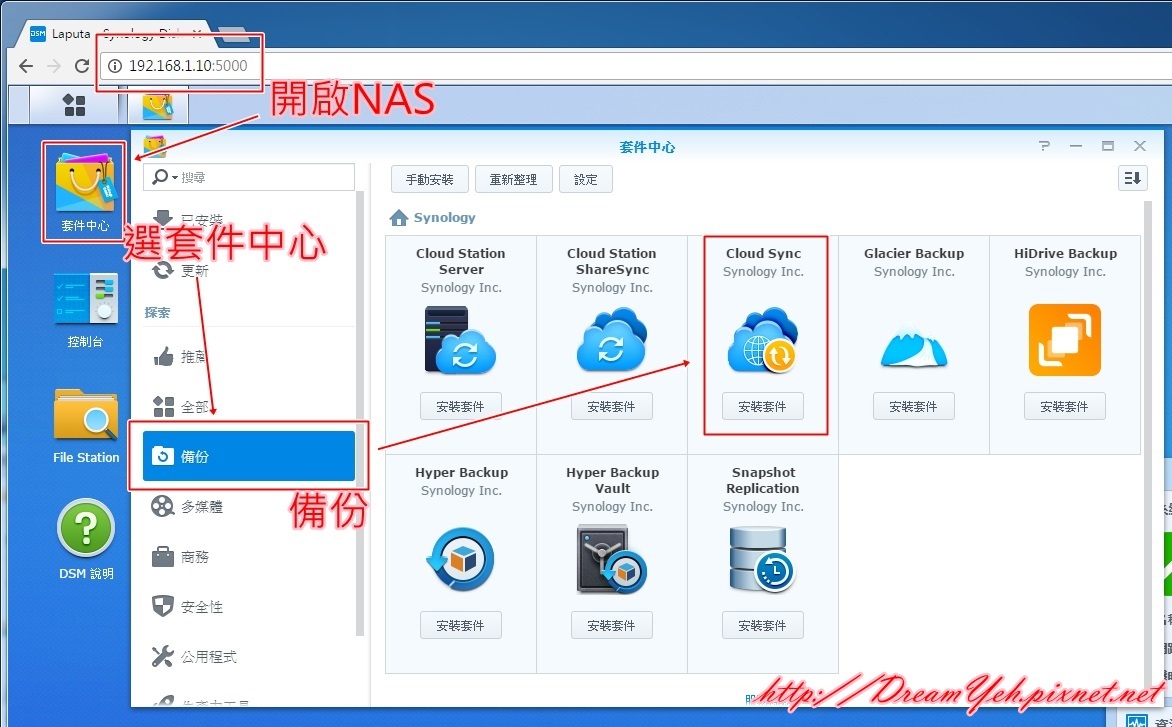 進入DSM畫面,選擇左邊的「套件中心」、跳出視窗。接著選左邊的備份,你就可以在右邊看到「Cloud Sync」了,趕緊按下安裝吧!