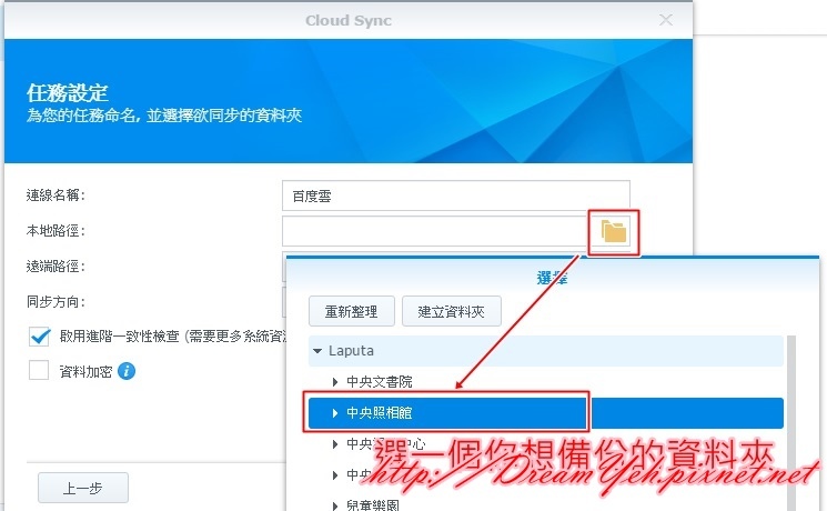 選擇一個本地路徑,這邊對應到的就是你NAS上的一個目錄資料夾。對於筆者來說,這邊是已經整理完全的東西,你可以參考筆者怎麼設定,也可以自己在DS916+上,建立一個你喜歡的資料夾當本地目錄。