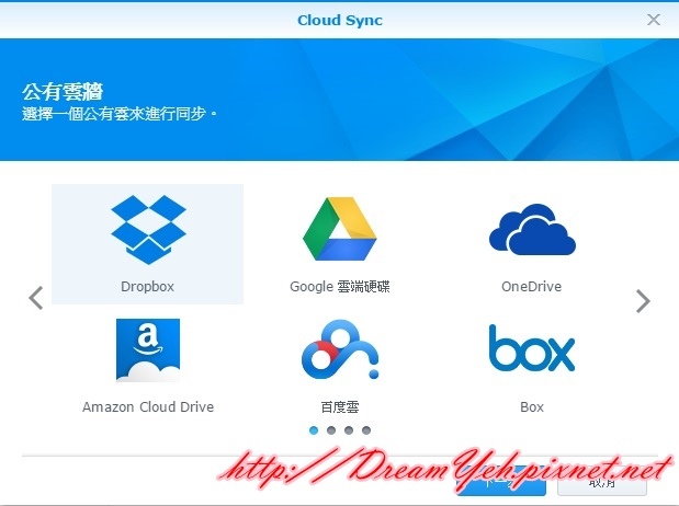 第一次開啟,就會請你選擇一個「公有雲」來進行同步,這邊我們選擇大家最常用的Dropbox為例子,點選後選下一步