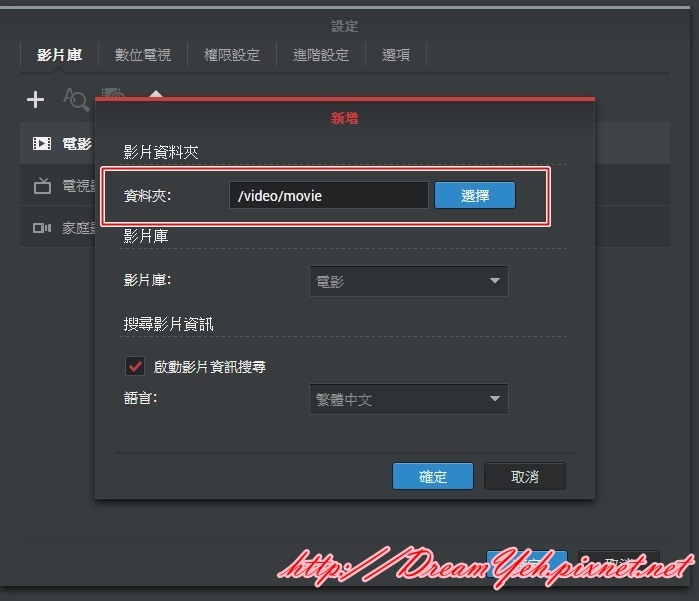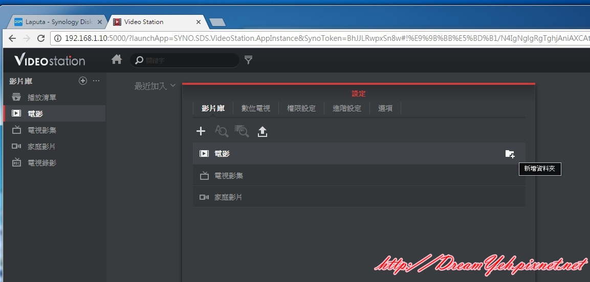 這邊Video Station將我們的影片分為四類-電影、電視影集、家庭影片以及電視錄影。以筆者而言前三者都是有特定資料夾的。