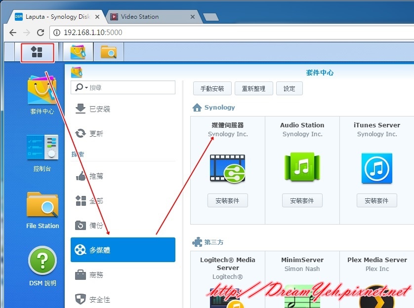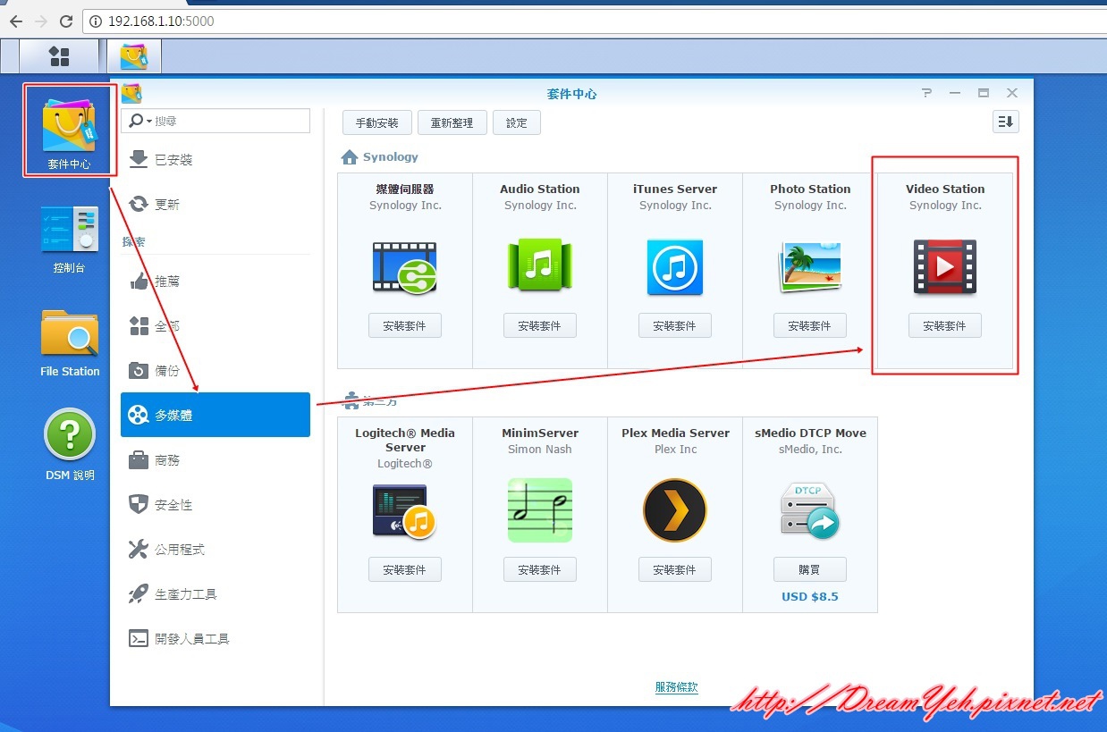 如何安裝呢?首先當然也是打開選單,到套件中心去進行安裝。(套件中心->多媒體->Video Station)