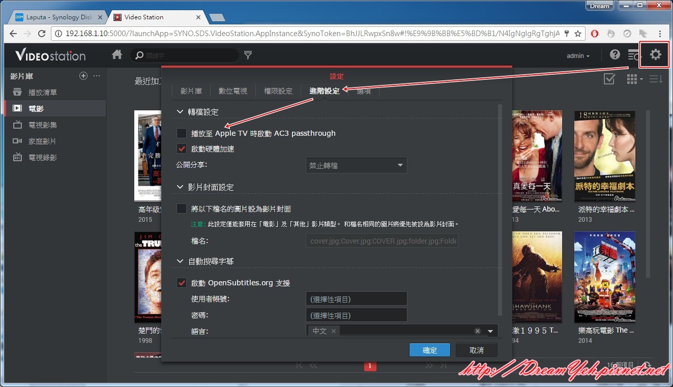 在DSM6.0的Video Station系統裡,你可以透過「按下齒輪進入設定」->「選取進階設定分頁」,將「播放至Apple TV時啟動 AC3 passthrough」以及「啟動硬體加速」開啟。前者是在你擁有Apple AV時使用,讓音效可以支援AC3 5.1聲道功能。後者則如字面解釋,就是硬體加速功能。