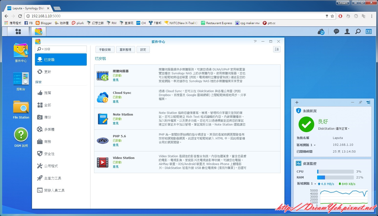 首先如何安裝呢?方法也很簡單,進到DSM系統(什麼?你還不會?如果你還沒設定NAS為固定IP的話,請直接點「找尋我的NAS」吧)。