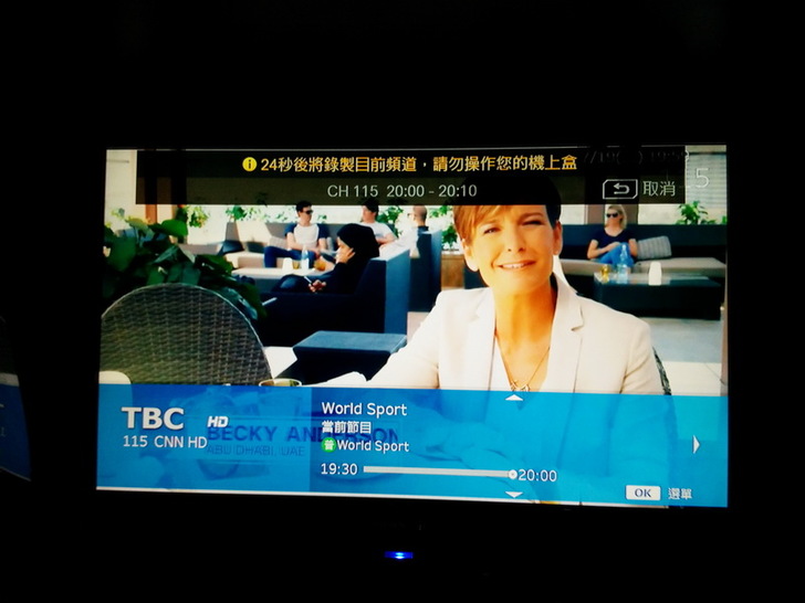說到預約錄影的部份,我先設定CNN HD頻道,當時間快到的時候,螢幕畫面就會出現提示~告知等會要錄影