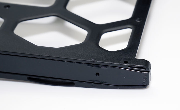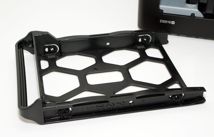 圖:抽出來的硬碟托盤,在兩邊螺絲固定處都有保護條,需要先拆卸下來才能安裝上螺絲。