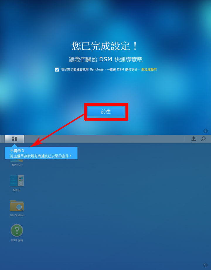圖:什麼?DSM已經完成設定了?沒錯,就是這麼簡單,接下來按一下「前往」來進入我們的DSM系統主畫面吧!第一次進入會有操作界面的教學,建議大家可以稍微看一下哦!